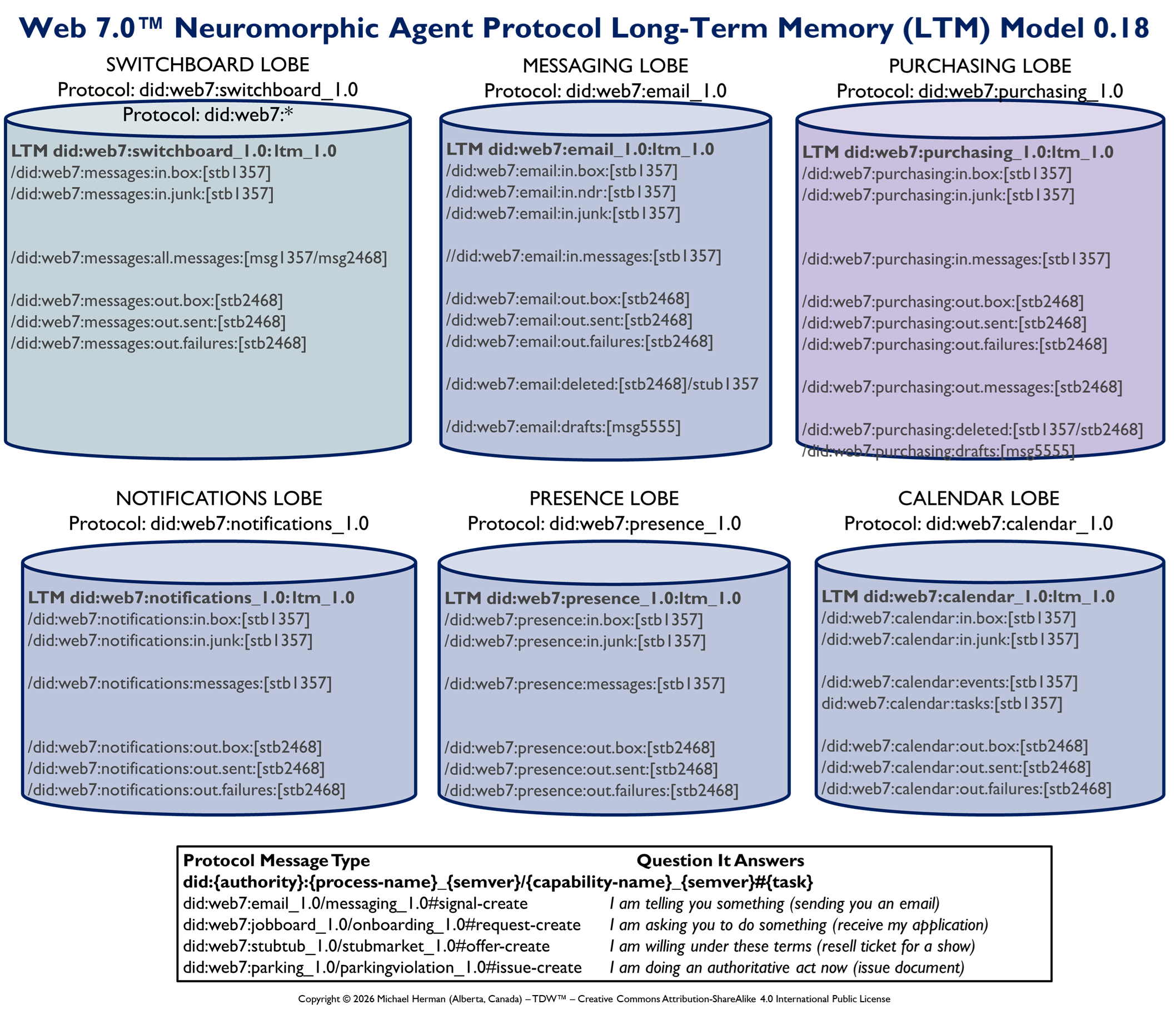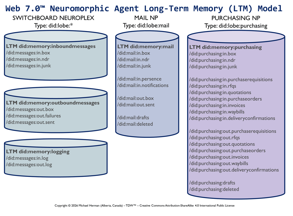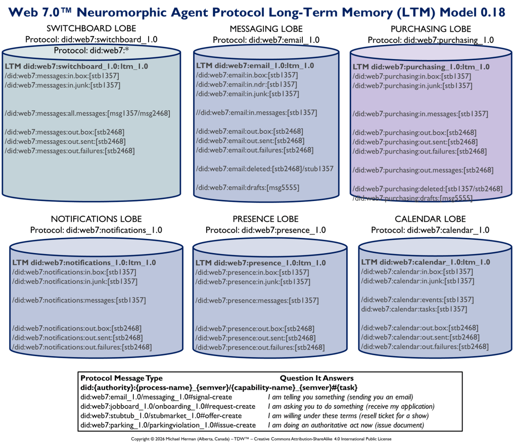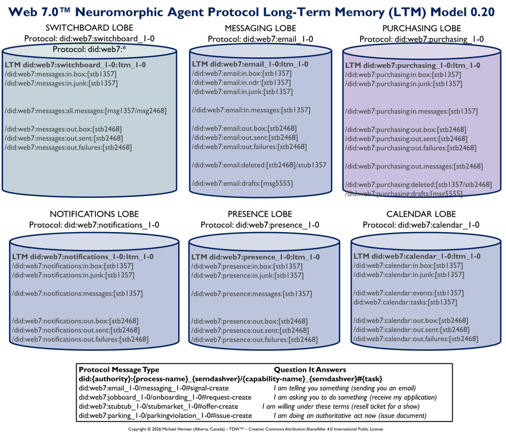 Figure 1 is an all-in illustration of the conceptual architecture of a Web 7.0 Neuromorphic Agent. A Web 7.0 Agent is comprised of a Frontal LOBE and the Neural Messaging pathway. An Agent communicates with the outside world (other Web 7.0 Agents) using its Outbound (Talking), Seeing, and Inbound (Listening) Interfaces. Agents can be grouped together into Neural Clusters to form secure and trusted multi-agent organisms. DIDComm/HTTP is the default secure digital communications protocol (see DIDComm Messages as the Steel Shipping Containers of Secure, Trusted Digital Communication). The Decentralized Identifiers (DIDs) specification is used to define the Identity layer in the Web 7.0 Messaging Superstack (see Figure 6 as well as Decentralized Identifiers (DIDs) as Barcodes for Secure, Trusted Digital Communication).