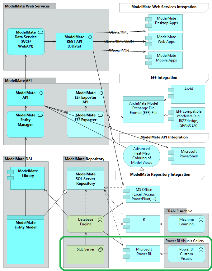 Quoting from Crossing the EA Chasm: Open Repository Strategies for Enterprise Architecture, “ModelMate is a working implementation of a Microsoft SQL Server and Neo4j graph database-based repository for managing arbitrarily large collections of arbitrary entities, properties, relationships, views, etc.to enable analysis, visualization, and understanding using easily-available open source and COTS (commercial off the shelf) business intelligence (BI), data visualization, and machine learning (ML) platforms, tools and cloud services.”