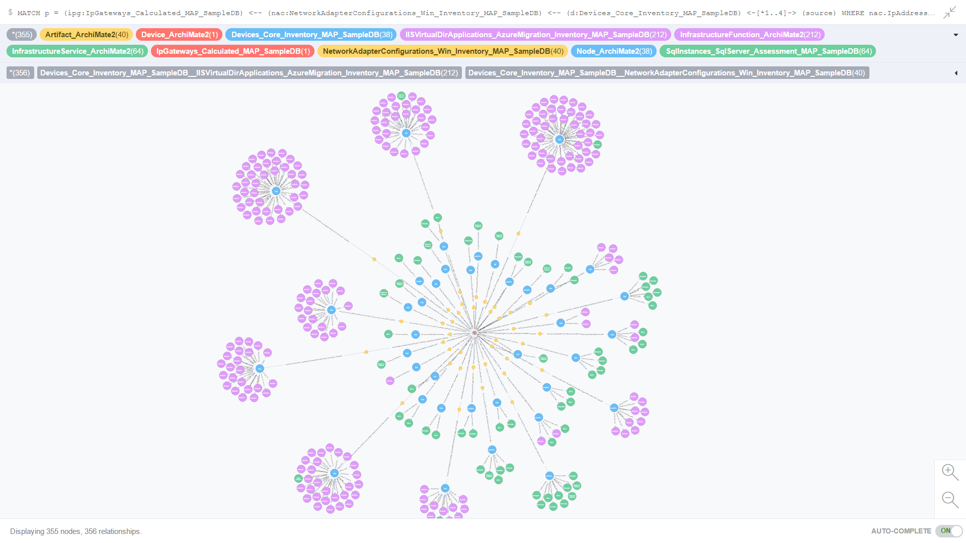 Pretty cool. The green dots are database services (SQL Server instances to be exact – almost every possibly product edition can be found in this subnet: SQL Server Express, Developer, Enterprise, Datacenter, etc.) modeled as Infrastructure Services; the blue dots, servers (Windows physical and virtual servers) modeled as Infrastructure Nodes; and, the purple dots, web servers (IIS virtual directory applications to be exact) modeled as Infrastructure Functions.