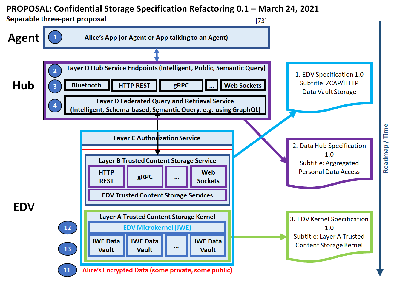 Based on the March 11 Zoom discussion where we worked hard to discern the differences between Agents, Hubs, and EDVs (and I believe were largely successful IMO), I’ve like to propose to the SDS/CS WG that we refactor the current Confidential Storage specification into 3 separable parts/specifications. I also present a high-level roadmap (simple ordering) for how the WG might proceed if this refactoring is accepted (or at least, if the first part/first new specification is accepted).
