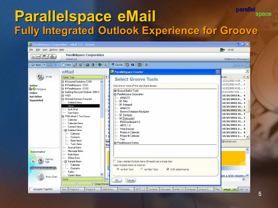 (4/5) Groove Tools like Parallelspace eMail …the fully integrated version of Microsoft Outlook that ran transparently inside Groove Workspace. #FirstPrinciplesThinking. #CHMFellows