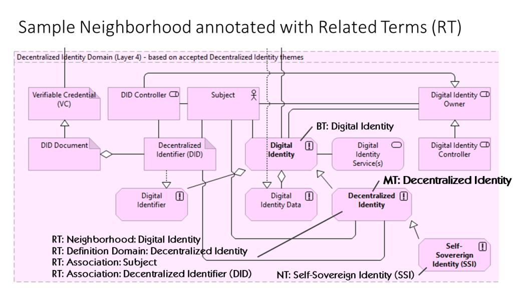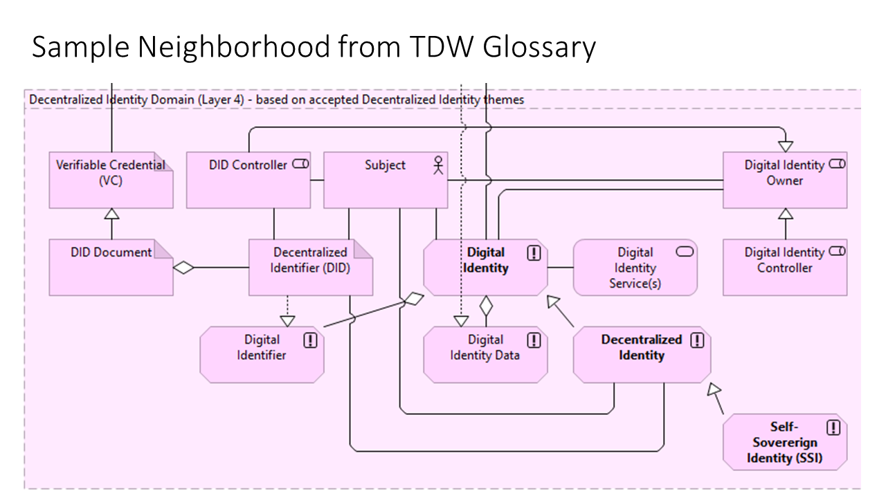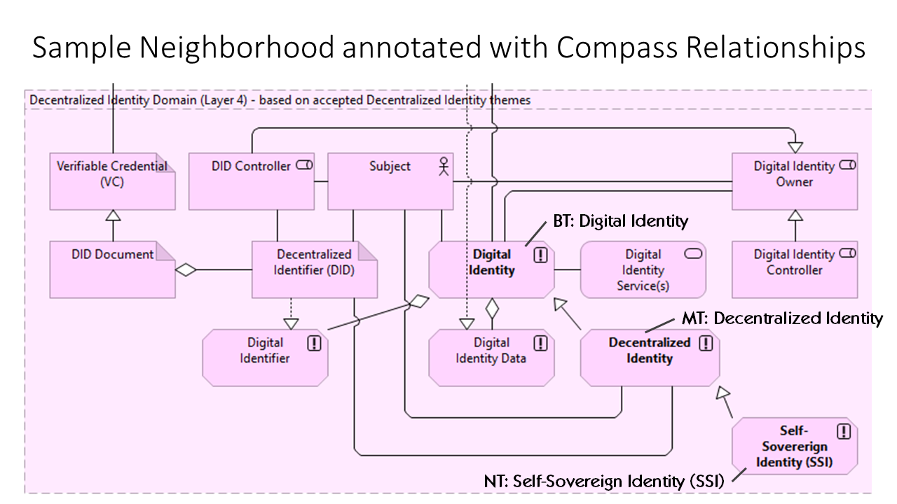 Figure 1. TDW Glossary Relationship Compass Figure 2. Neighborhood example from the TDW Glossary: MT: Digital IdentityFigure 3. TDW Glossary Relationship Compass for an example: MT: Decentralized IdentityFigure 4. Neighborhood example annotated using the TDW Glossary Relationship Compass: MT: Decentralized IdentityFigure 5. Neighborhood example annotated with Related Terms (RT): MT: Decentralized Identity