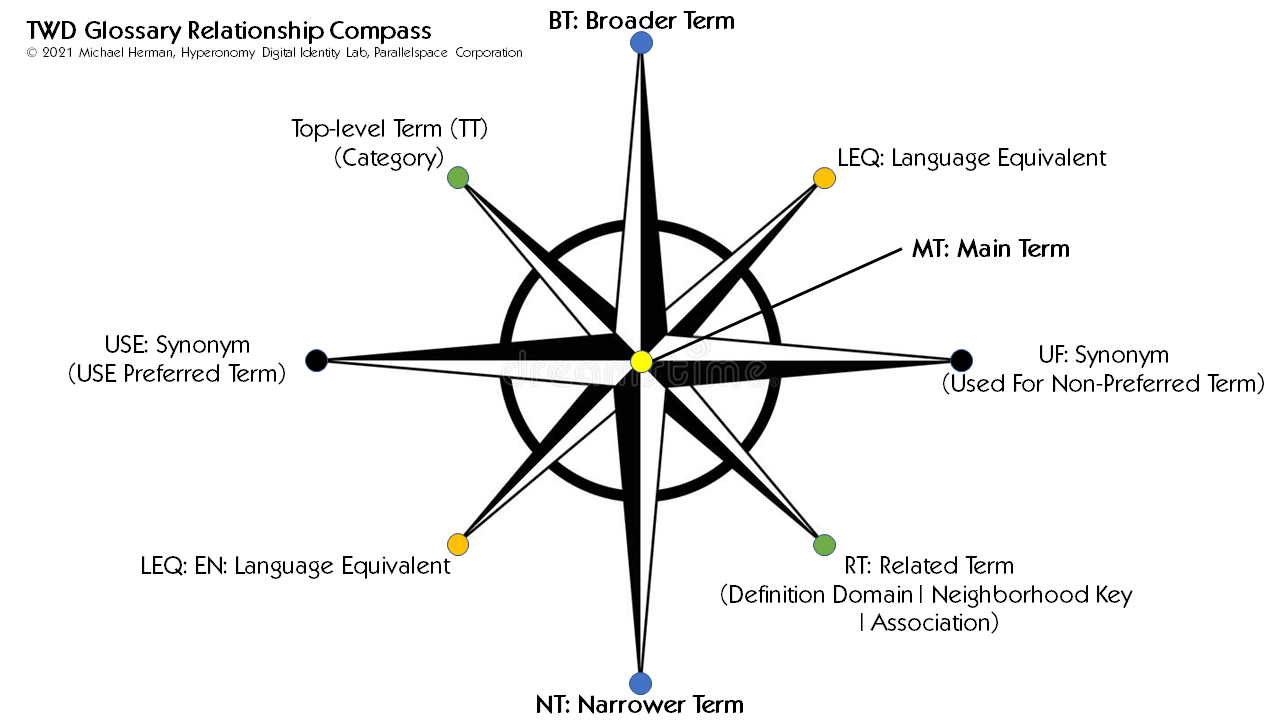 The points of the TDW Glossary Relationship Compass are based on the relationship types defined in ANSI/NISO Z39.19-2005.