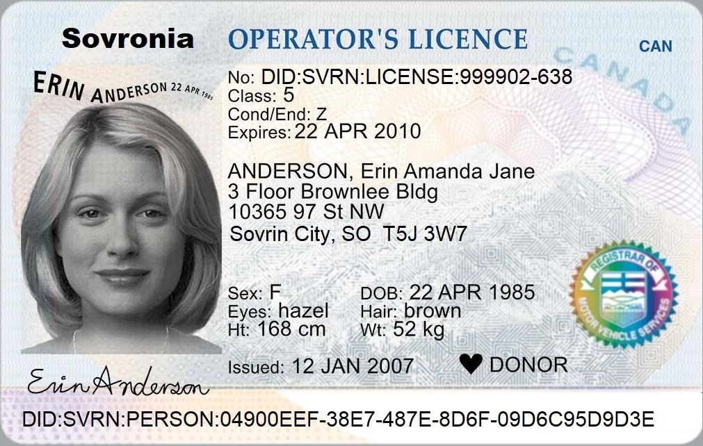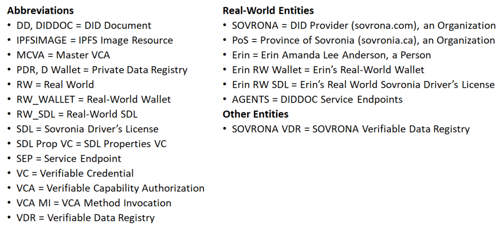 1. Erin. Erin is a RW_PERSON (“Real World” Person) and a citizen of the Province of Sovronia. Erin also holds a (valid) Sovronia Driver’s License (SDL) and controls a “Real World” Wallet (RW_WALLET) as well as a Digital Wallet (PDR).
