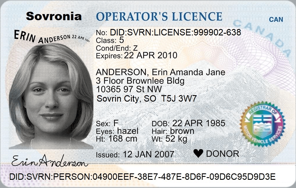 The scenario used to model the VE-ARM is an example of a citizen (Erin) of a fictional Canadian province called Sovronia holding a valid physical Sovronia Driver’s License (Erin RW SDL) as well as a digital, verifiable Sovronia Driver’s License (Erin SDL).