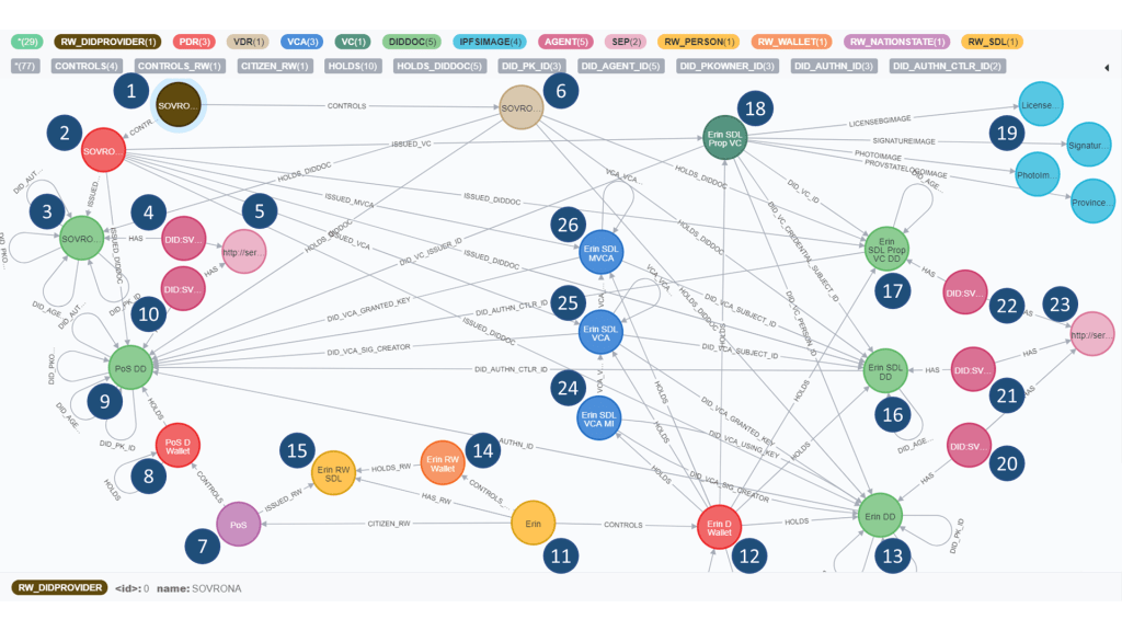 8. PoS RW Nation State. The Province of Sovronia is a (fictitious) Province (RW_NATIONSTATE (“Real World” Nation State)) in Canada and the legal government jurisdiction for the citizens of the province. The Province of Sovronia is an Organization. The Province of Sovronia issues “Real World” Sovronia Driver’s Licenses (SDLs) but relies on SOVRONA to issue digital, verifiable SDLs.