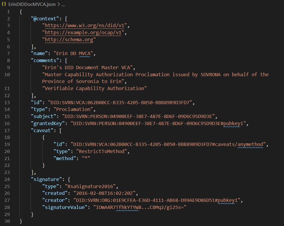 7. Erin DD MVCA. Erin DD MVCA is the Master Verifiable Capability Authorization (MVCA) created for Erin’s DID Document at the time that the DID and DID Document were first issued by SOVRONA on behalf of the Province of Sovronia for Erin. (A new MVCA is created whenever a new DID and DID Document are issued by a TDIDP. The MVCA grants authorization for any and all methods to Erin.)