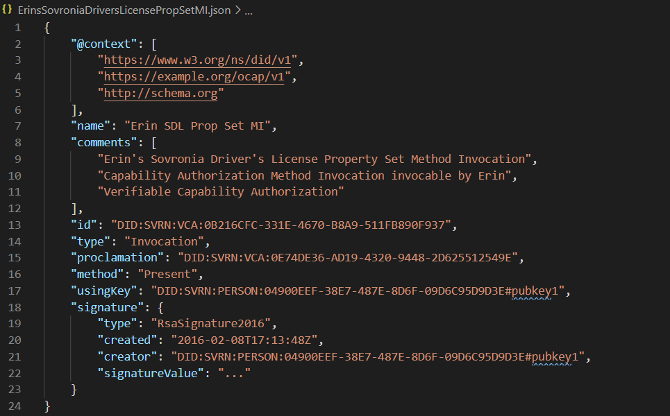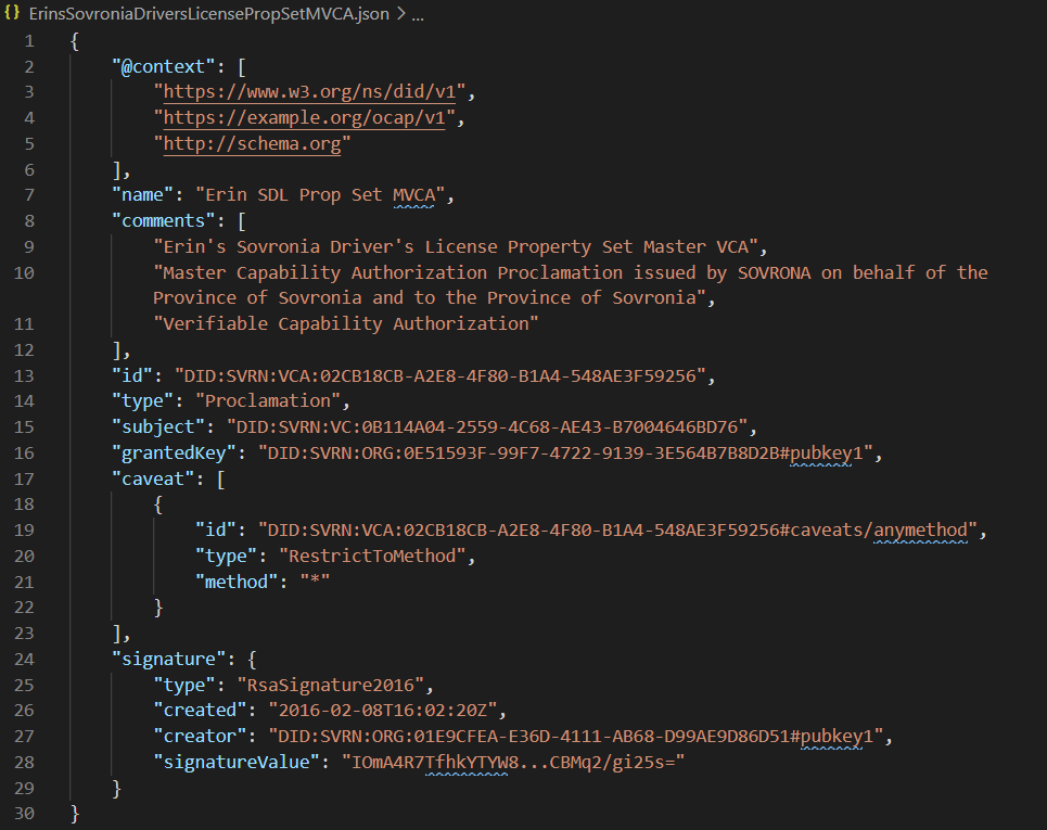 17. Erin SDL Prop Set MVCA. Erin SDL Prop Set MVCA is the Master Verifiable Capability Authorization (MVCA) created for Erin’s SDL Prop Set (DD) at the time that the DID and DID Document were first issued by SOVRONA on behalf of the Province of Sovronia for Erin’s SDL. (A new MVCA is created whenever a new DID and DID Document are issued by a TDIDP. The MVCA grants authorization for any and all methods defined for the subject to the effective issuer. In this case, the effective issuer is the Province of Sovronia.)