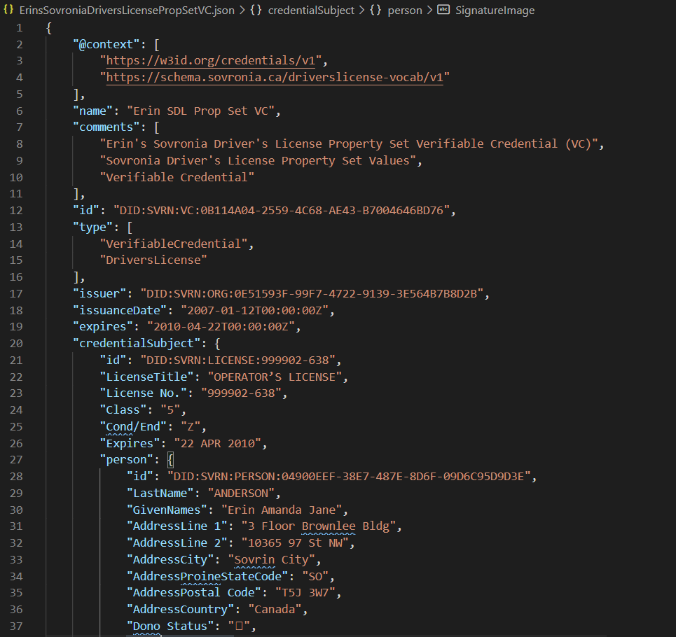 16. Erin SDL Prop Set DD. Erin SDL Prop Set DD is the primary DIDDOC (DID Document) for the Verified Credential (VC) that is used to represent the properties of Erin’s digital, verifiable SDL (and their values). The properties (and their values) are represented in Erin SDL Prop Set, a Verifiable Credential associated with the DID in Erin SDL Prop Set DD.