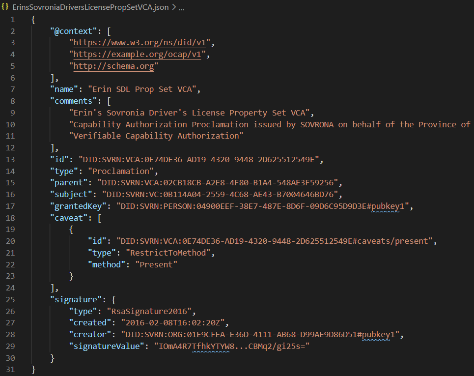 18. Erin SDL VCA. Erin SDL VCA is the Verifiable Capability Authorization (VCA) created for Erin’s SDL Prop Set DD. The VCA was issued by the Province of Sovronia authorizing Erin to be able to present the properties (and their values) of Erin’s SDL to a third party using the Present method associated with Erin’s SDL Prop Set and supported (implemented) by Erin’s AGENT. The parent of Erin’s SDL VCA is the Erin SDL MVCA.
