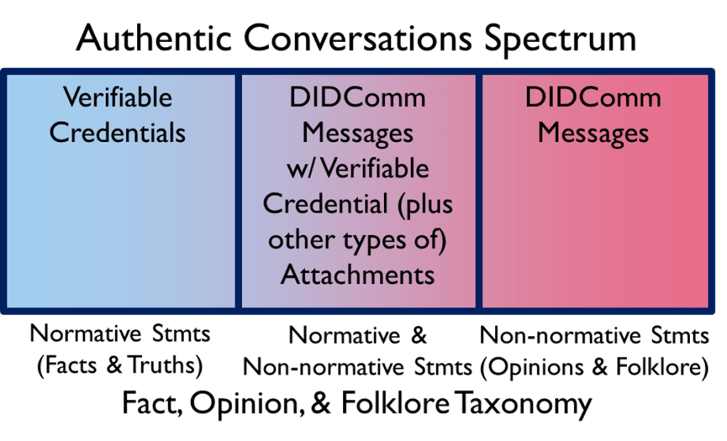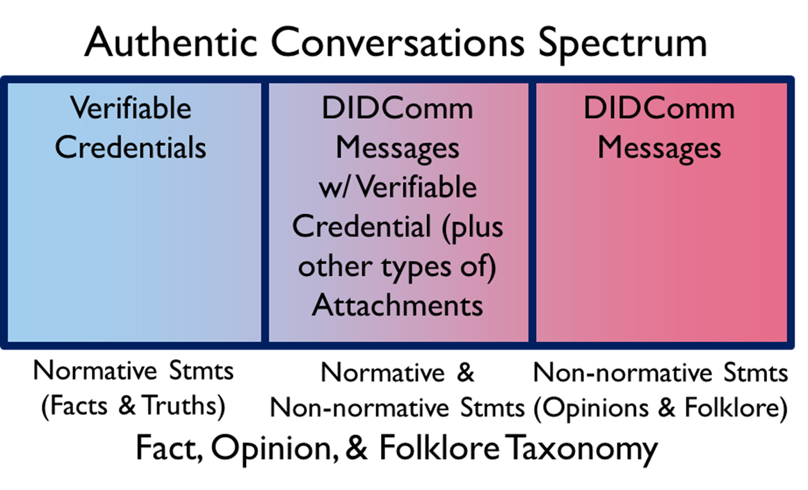 The driver for the above taxonomy is a new belief in the mind of the author is that only facts or truths should be embedded into verifiable credentials. This gives rise to the concept of the Authentic Conversations Spectrum (illustrated below). The author no longer believes that verifiable credentials can be used or should be used to encode “all data on the planet”.