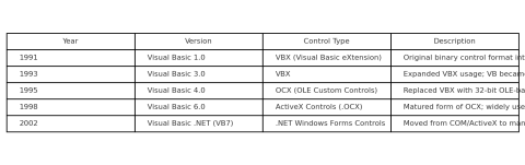 Microsoft introduced Visual Basic controls — often referred to as VBX controls — in 1991, with the release of Visual Basic 1.0 for Windows.