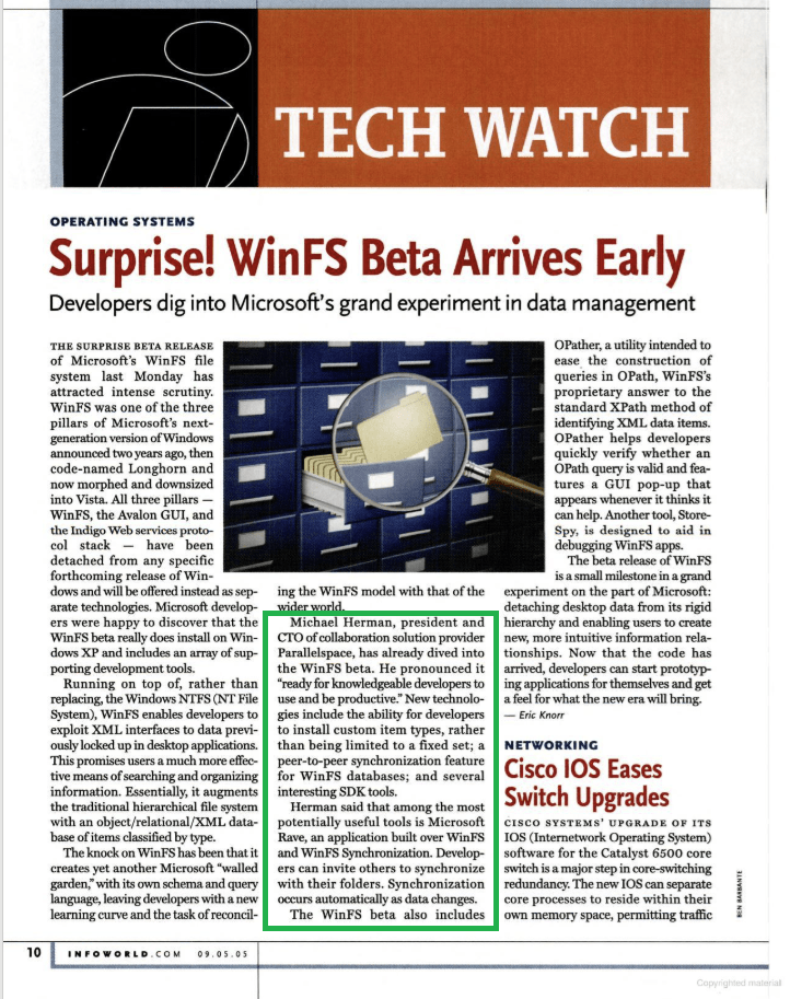 - Surprise! WinFS Beta Arrives Early, InfoWorld, September 5, 2005.