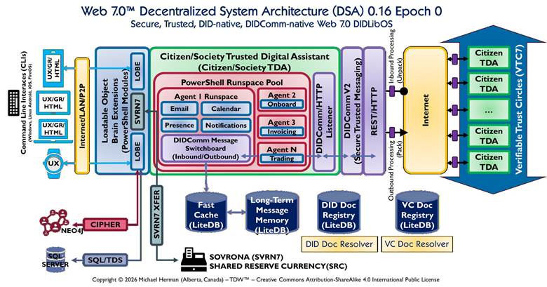 Figure 1. Web 7.0™ Decentralized System Architecture (DSA) 0.16 Epoch 0 — Citizen/Society Trusted Digital Assistant (TDA). © 2026 Michael Herman (Alberta, Canada) — TDW™ — CC BY-SA 4.0.