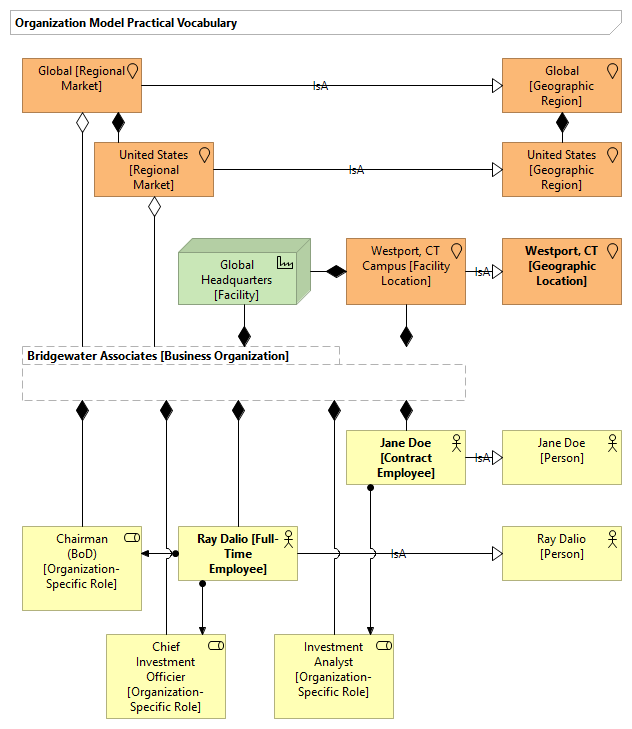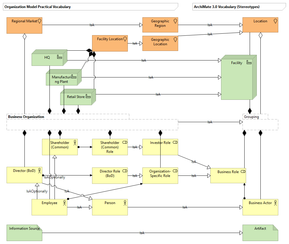 These choices, in turn, have a secondary effect in terms of the valid set of relationships that can be used to compose or aggregate the elements that comprise a Business Organization.