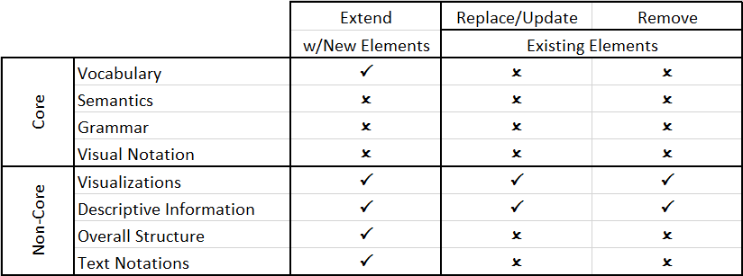 “MA Core Set” Spreadsheet. Wierda worked to consolidate various data sources from Step 1 above to create the “MA Core Set” Mastering ArchiMate relationship matrix (plus a number of other relationship matrices that Wierda used for comparative analysis and troubleshooting purposes). The “MA Core Set” represents the “seed” or Core Set of (non-derived) ArchiMate relations. Wierda created this Core Set over several iterations reviewing the word-for-word text of the Specification, the inheritance diagrams, as well as incorporating his extensive practical knowledge and experience documenting ArchiMate in the book entitled