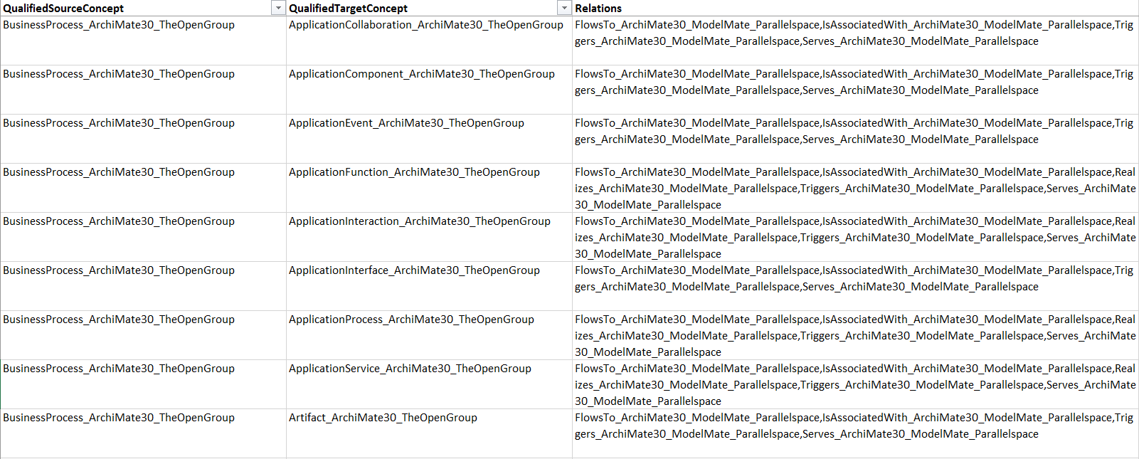 Figure 10. is the result of an ad-hoc CQL query against all Core relationships where both the source and target element prototypes are from the Business domain.