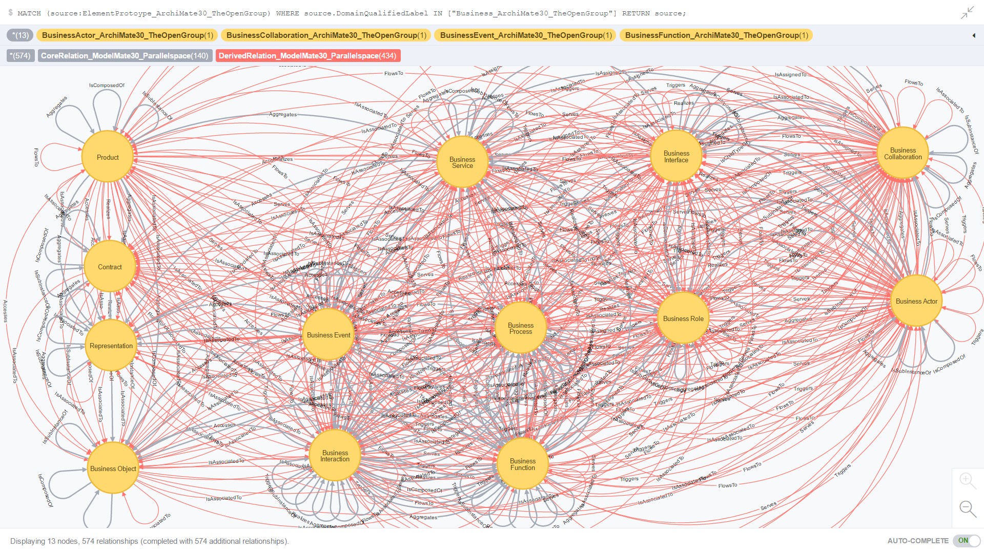 Figure 8. is the result of an ad-hoc CQL query against all element prototypes in the Business domain; more specifically, where both the source and target element prototypes are in the Business domain.