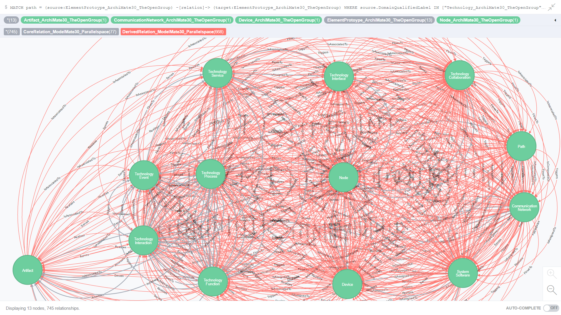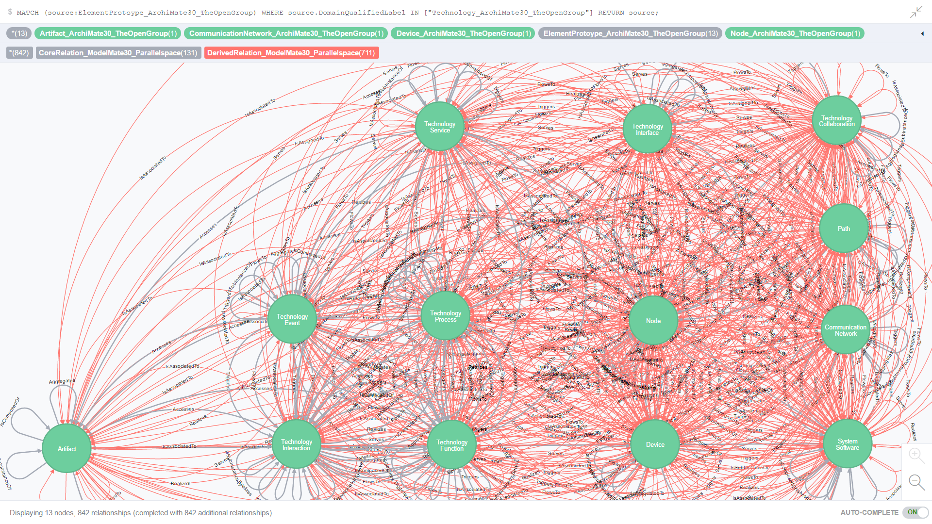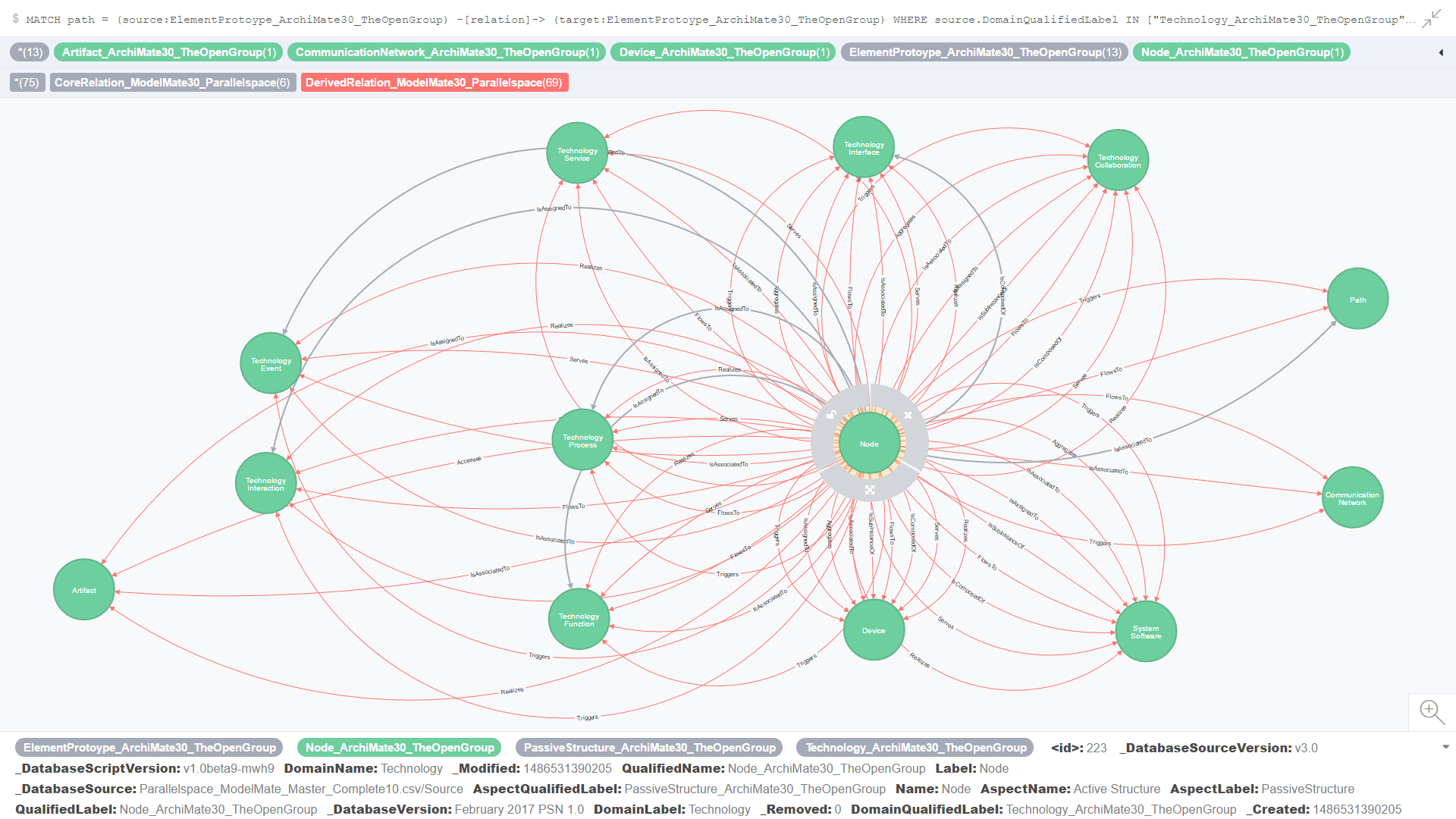 Figure 18. is the result of an ad-hoc CQL query against all Core and Derived relationships where both the source and target element prototypes are from the Technology domain and are connected to the Node element prototype.