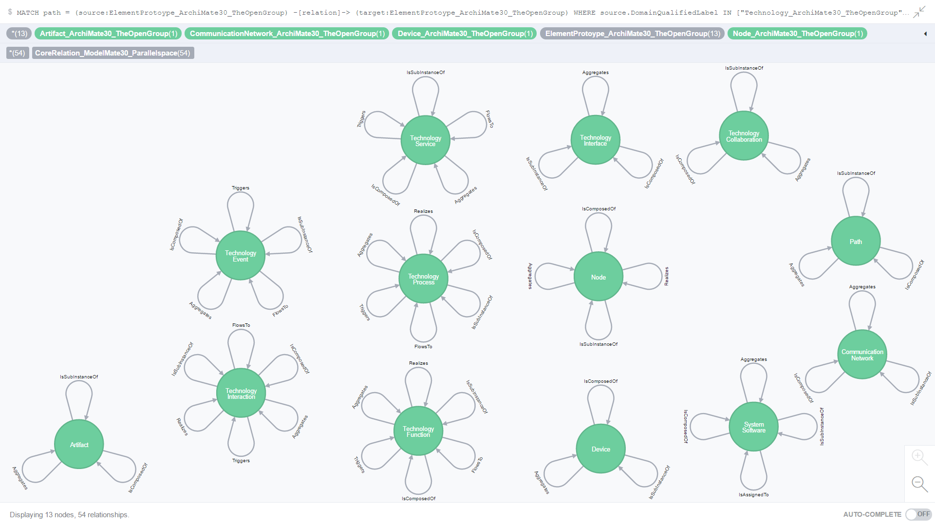 Figure 15. is the result of an ad-hoc CQL query against all Core relationships where both the source and target element prototypes are from the Technology domain and are identical to each other.