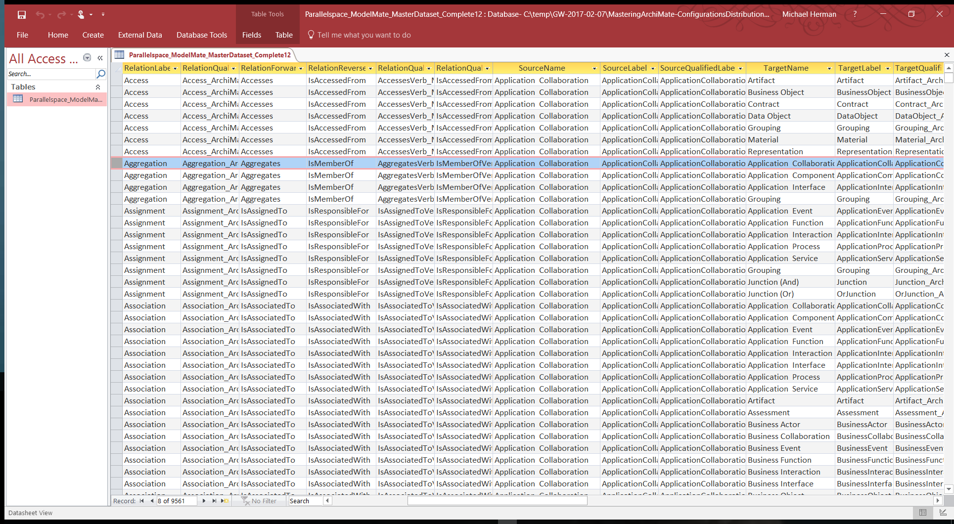 Also considered part of Step 9, the CSV file is imported into an empty Microsoft Access database. The datatype of the InInputRelation is changed to be a Yes/No (boolean) field. The database file is given the same name as the CSV file but with a suffix of .accdb.