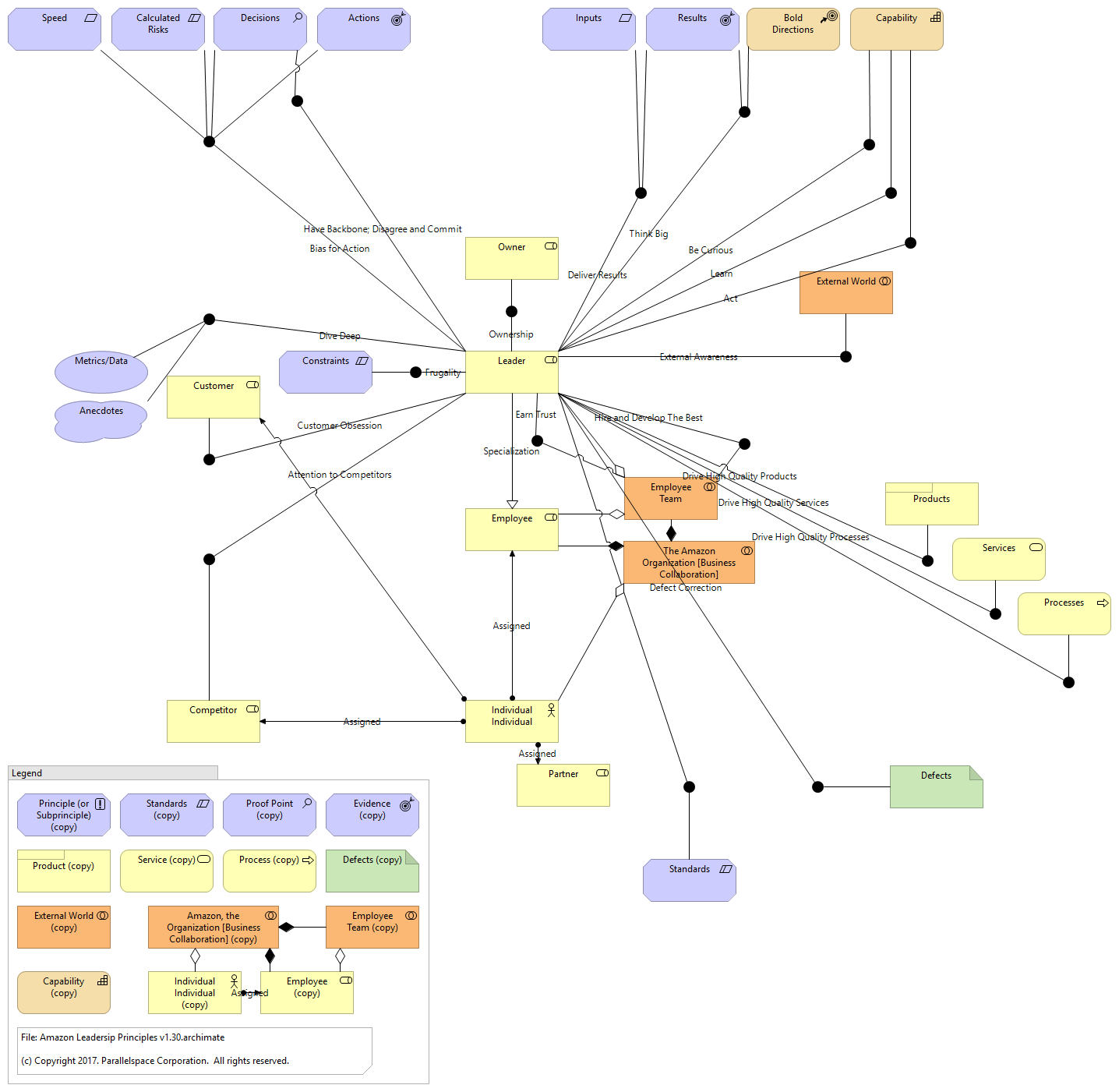 • Appendix A – Amazon Leadership Principles (and Subprinciples) contains an ArchiMate enterprise architecture model that depicts the (and then decomposes) the 14 Amazon Leadership Principles into multiple levels of subprinciples. Scroll down to the bottom of this article to check it out.